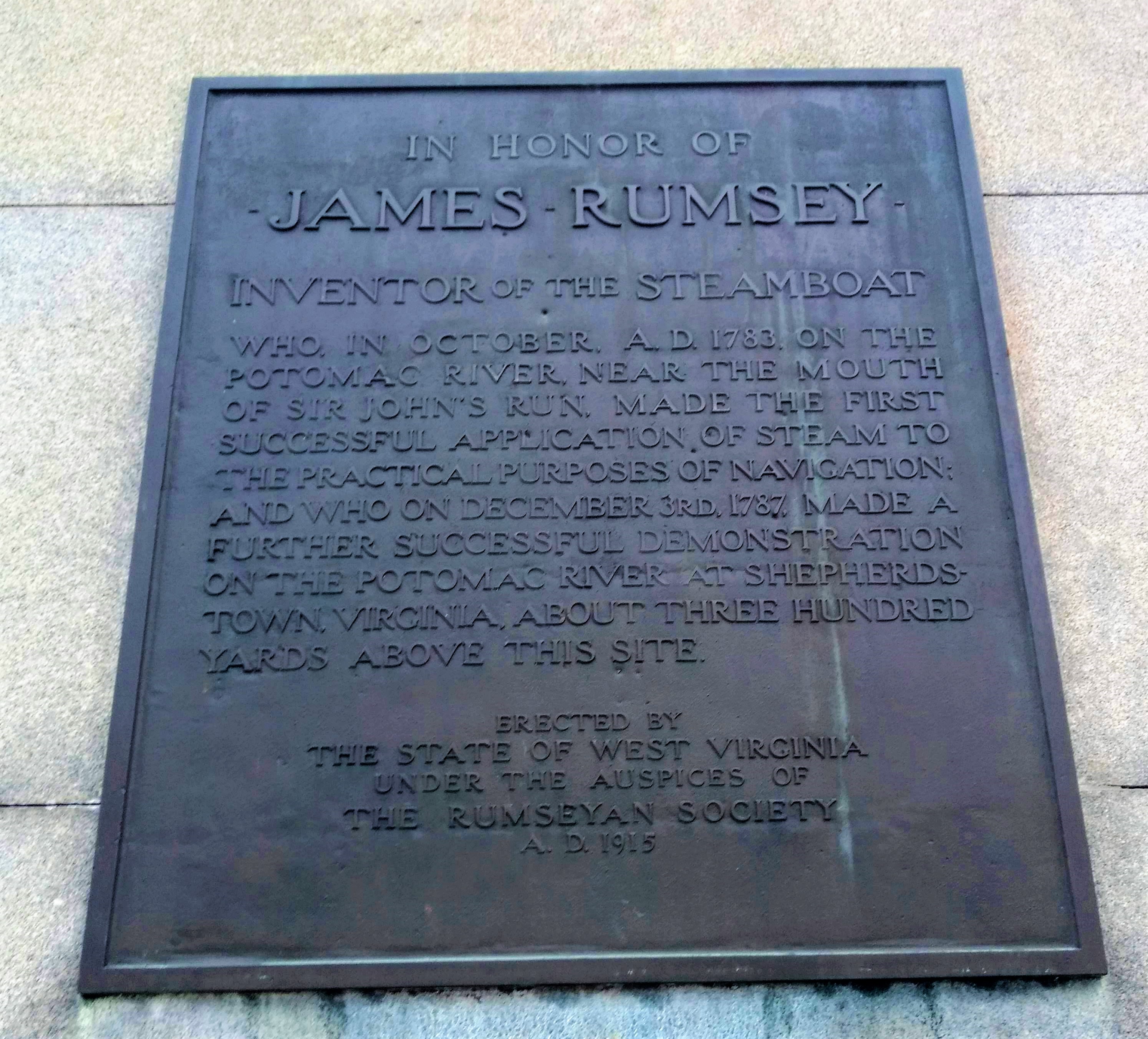 On the monument is a bronze plaque with the following inscription: “In Honor of James Rumsey Inventor of the Steamboat.” So who was James Rumsey? Born in Maryland in 1743, James was raised in a working class family. Though he lacked any formal schooling, James had knack for engineering. He even designed a house for a pre-president George Washington.
